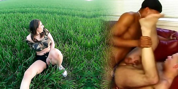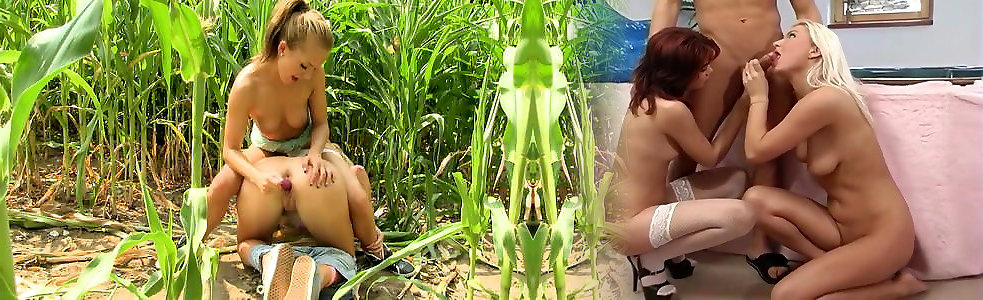 Uber-sexy blonde lesbos kissing and fake penis frolicking in field