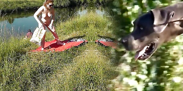Nudist beach. Public nudity. Sexy MILF without panties and bra sunbathes naked is not shy about fisherman. Naked in public. Milf