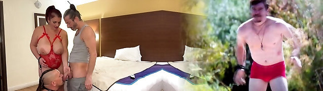 Hotel bisexual threesome with chubby basty Brunette in red bodysuit