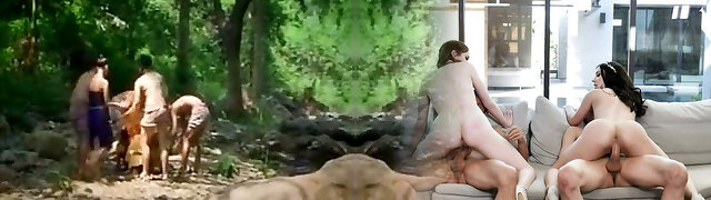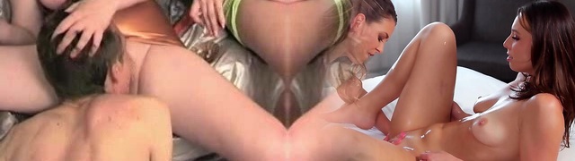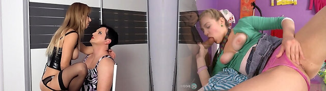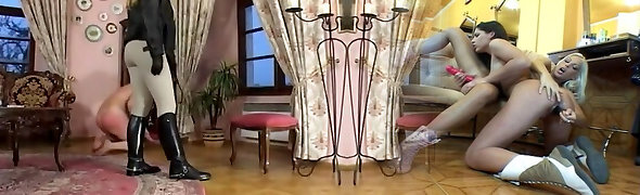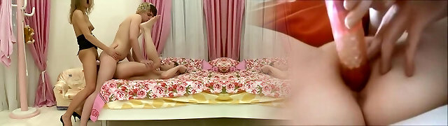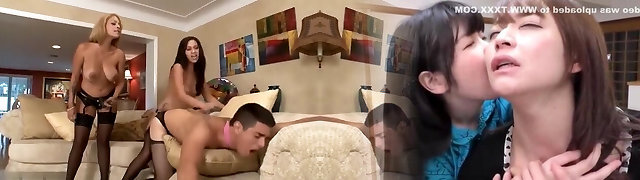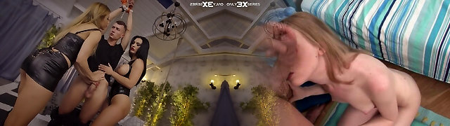 two sex-starved misrtesses fukc one corded up dude with a big penis
