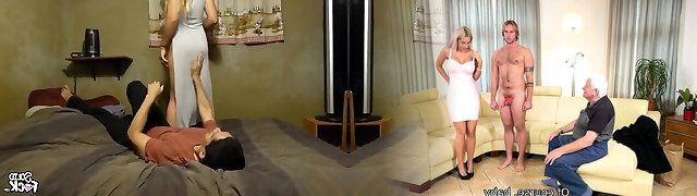 Super-sexy mature blonde woman on the bed shows her goodies snd facesits her dude