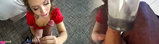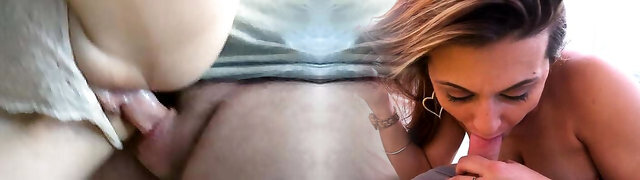 Cute face bitch with omnster tits sucking on trouser snake