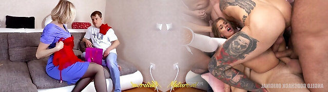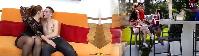 Delicious blonde MILF in stockings pnatyhose fukcs successful boy