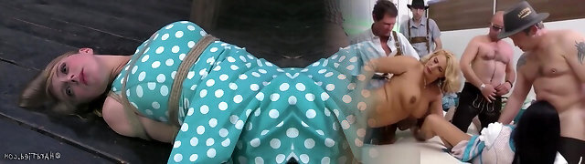 Tied up blnde gets bonded and toyed by two chicks