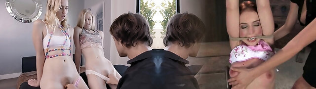 Hot platnum-blonde girls take care of his big cock