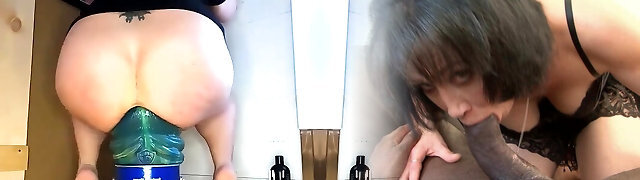 Inexperienced milf insedrt in her pussy large bottle to please herself at kitchen
