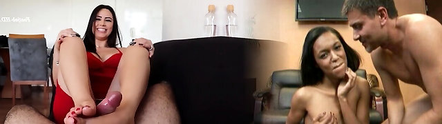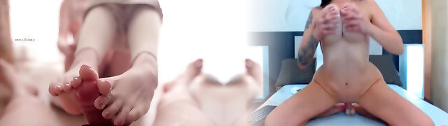 A girl gives an amazing sole job with her wondergul feet and makes a guy cum with a hj