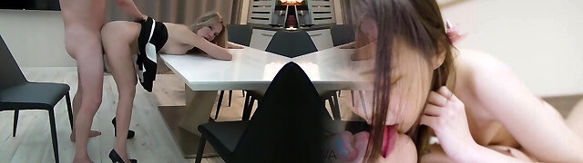 Blonde being fukced on the kitchen table and got cuload on her nice backside