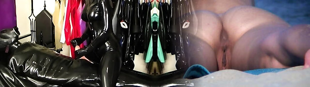 Lewbian in a latex suit bent over her mistress's knees and smacked