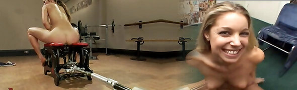 Blonde babe Charlotet Stokely plays with a poking machine in her guest room