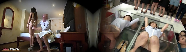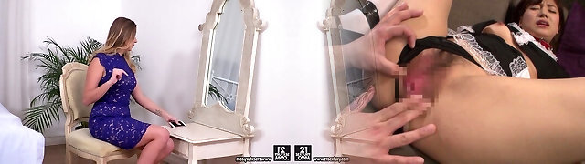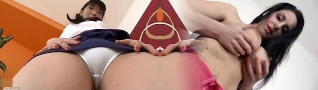 Enchanting Asian honies with petite tits unpinning her panties then fingering hesr pussy
