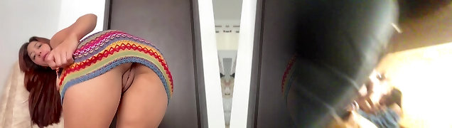 Teenj girl teases flashing her delicious little pussy and then fukcs with a fake penis