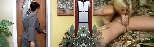 Buhsty blonde maid gets her mouth and vagina fukced by 2 dudes